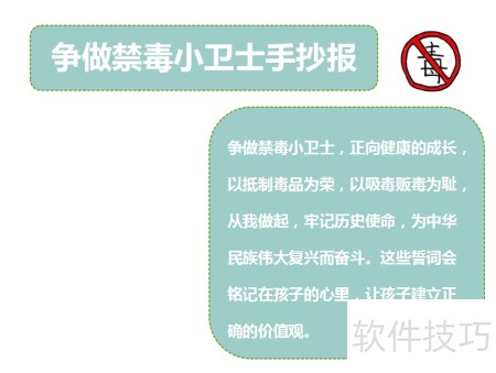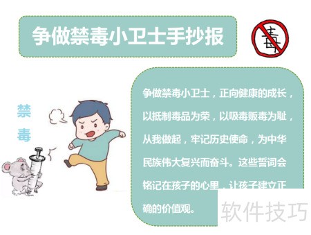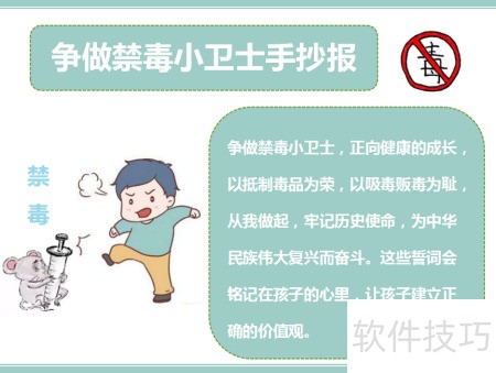 绘制文本框,填写争做禁毒小卫士手抄报的主题内容与相关知识。