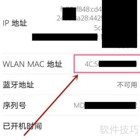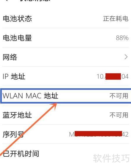 - 在手机状态信息中查看无线网络的MAC地址,位置所示。