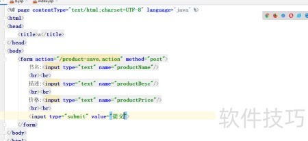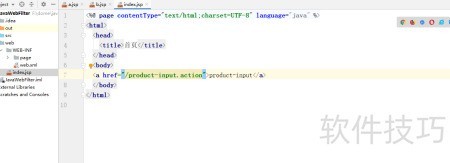 在index.jsp页面添加以下链接,用于跳转至产品信息录入界面:```jsp 进入产品输入页面 ```