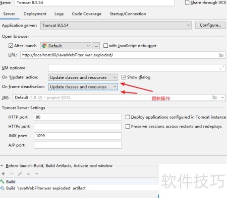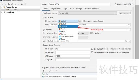 - 设置Tomcat服务器启动时打开浏览器,指定首页路径,并勾选Rebel实现热部署更新。