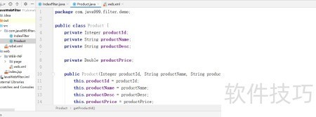 在同级目录中创建Product.java文件,用来存储客户端传递的信息并实现getter, setter方法以及参数化和非参数化的构造器。