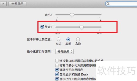 5、 选择Dock偏好设置后,弹出窗口中包含放大选项,通过滑动右侧滑块即可调节图标的放大比例。