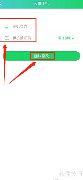 打开手机设置页面,填写手机号与验证码后,点击确认修改按钮完成操作。