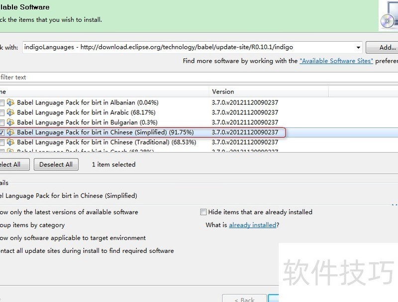 点击进入设置菜单,选择下载和安装新软件选项。接着在更新源页面中找到并复制http://download.eclipse.org/technology/babel/update-site/Rindigo地址。随后按照屏幕上的指示进行语言包的下载和安装过程。这样操作后,界面将自动转换为中文显示模式,使你更加舒适地使用Indigo版本的Eclipse开发环境。