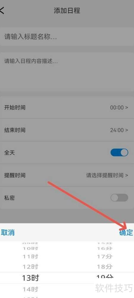 进入日程提醒设置页,选定提醒时间后确认即可。