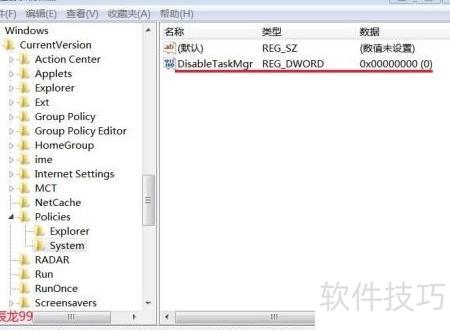 将新建项命名为 DisableTaskMgr,设置键值为 0,完成后关闭注册表编辑器。