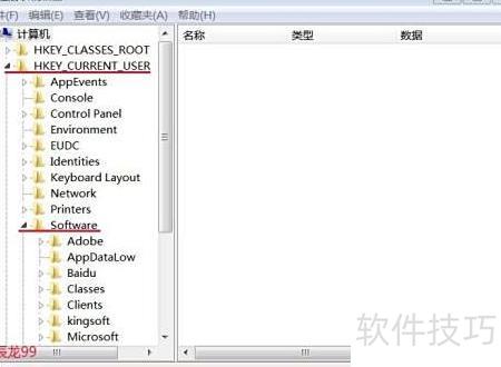 在注册表编辑器中,首先打开HKEY_CURRENT_USER>Software并深入搜索目标文件夹,此步骤至关重要。