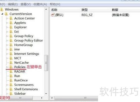 在CurrentVersion的展开项中找到Policies,然后用鼠标左键点击该选项即可。