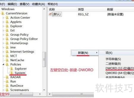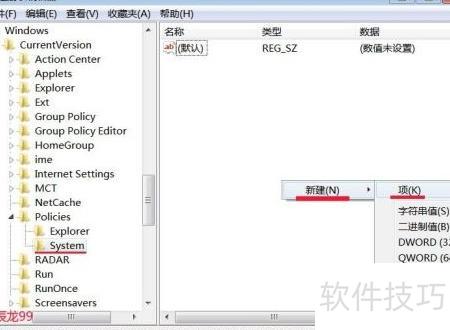 在Policies右侧窗口无System项时,在空白处右键,选择新建并命名为System。