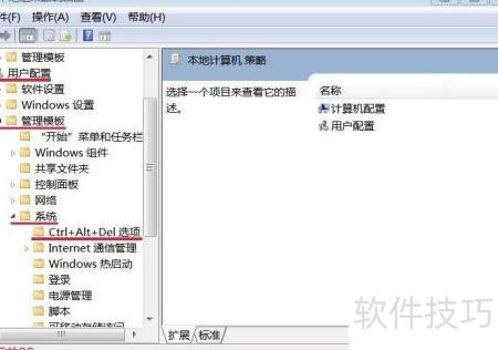 打开本地组策略编辑器,依次展开用户配置、管理模板、系统,找到Ctrl+Alt+Del选项。