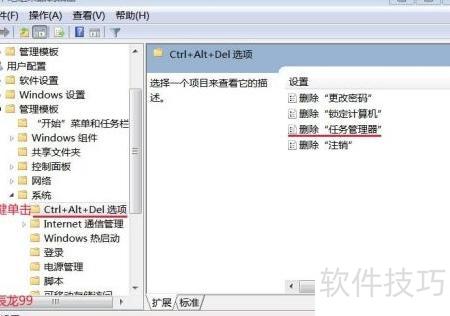 单击 Ctrl+Alt+Del 选项,在其右侧窗口中找到任务管理器,然后将其删除。