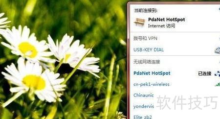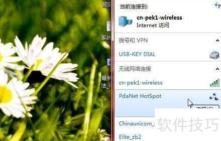 完成iPhone上的相关设置后,在笔记本电脑的WiFi列表中会显示iPhone作为路由器的名字。由于我们采用了默认的PdaNet HotSpot配置,所以可以直接在可用网络中看到这个热点名称并轻松连接,无需额外更改任何设置就能实现共享上网功能。