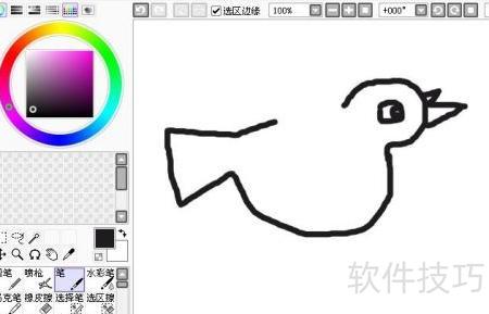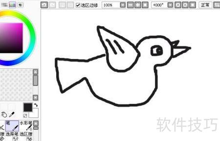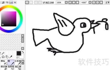 单击后,在SAI绘图区域将出现白色画布。选择铅笔工具,并调整为黑色颜料在画布上描绘飞翔鸽子的头部和喙部部分,参照示意图完成绘制。