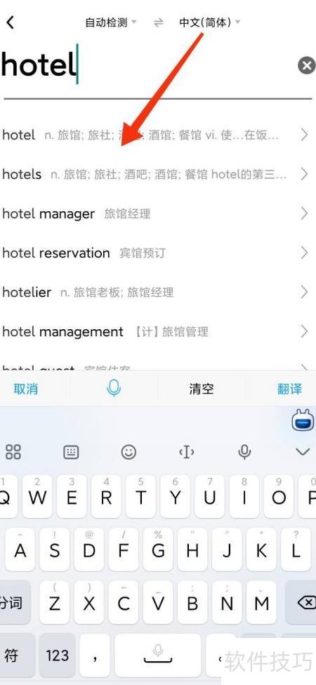 输入需翻译的词汇或语句,例如输入hotel,即可查看其翻译结果。