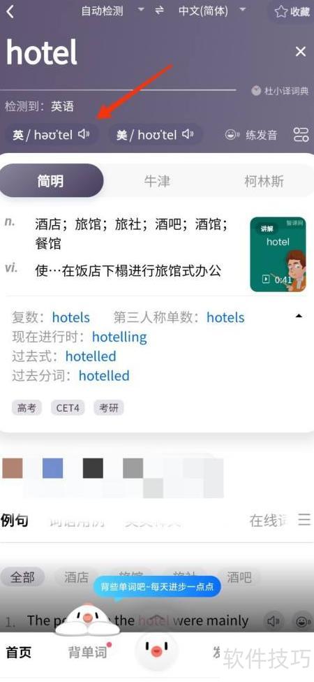 点击hotel图标,再点发音按钮,即可听到读音,轻松掌握正确发音方法。