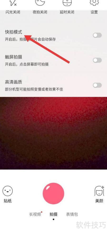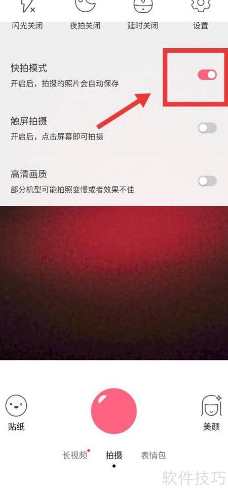 开启快拍模式后,开关变为红色即表示已成功启动。