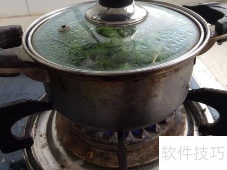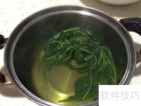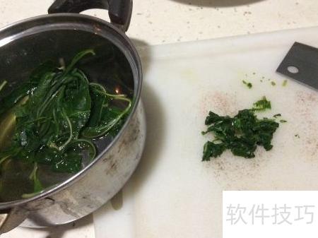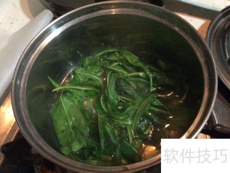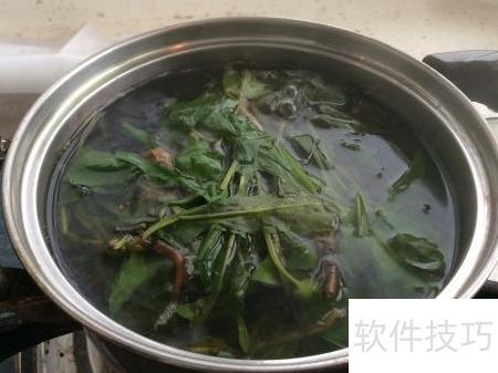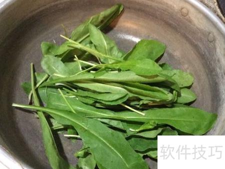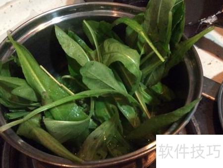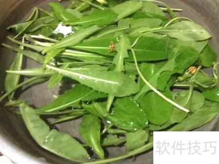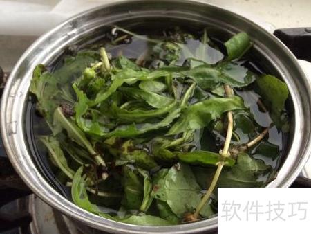 加热水煮至沸腾,加入蒲公英嫩叶,煮钟后熄火,取出部分叶片切碎备用。