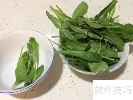 清洗蒲公英嫩叶并沥干水分,放入盘中;准备几片相似大小的叶子点缀其上。