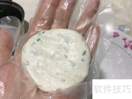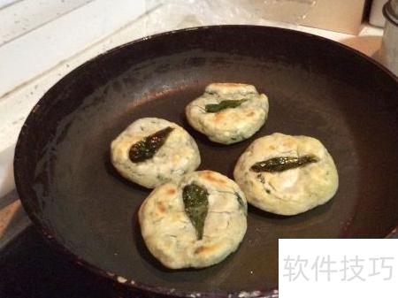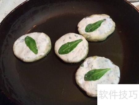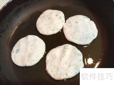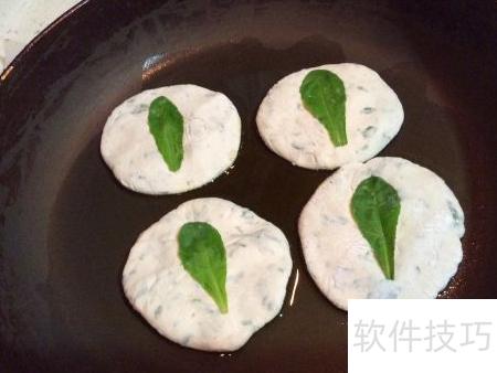 将食用油倒入不粘锅中,均匀摇晃润锅。将调好的蒲公英糯米面团均分为四份,取一份搓圆后轻轻压扁成薄饼状。依次做好每张饼的摆放整齐工作,确保它们之间有一定间隙以避免黏连。每张饼中央放一片装饰用的叶片,轻压使其自然粘附即可。