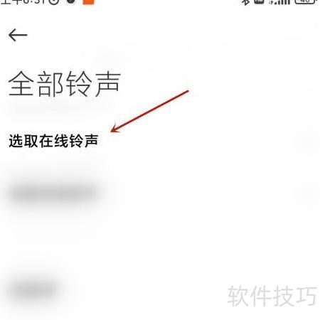 - 所示,点击红色箭头指向的选取在线铃声选项。