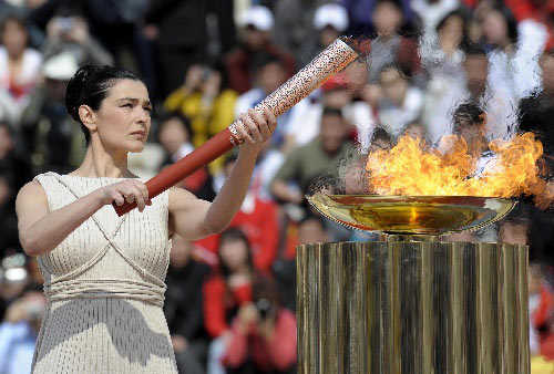 圣火在奥运发源地希腊的赫拉神庙前点燃,圣火采集方式遵循古希腊的传统,由首席女祭司在奥林匹亚的赫拉神庙前朗诵致太阳神的颂词,然后通过将太阳光集中在凹面镜的中央,产生高温引燃圣火,这是采集奥林匹克圣火的唯一方式。