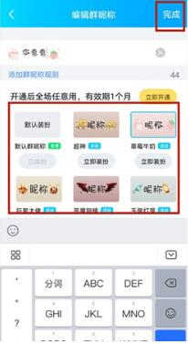 3、最后我们只需要输入昵称,然后选择群昵称装扮效果,点击立即装扮,再点击右上角的完成即可变成彩色昵称。