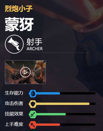 蒙犽是一名射手,有着强大的火力,能强力的压制对手。有着独特的弹射机制和大招支援的机制,在团战中能持续性的消耗对手血量,还能打出较高的AOE伤害。
