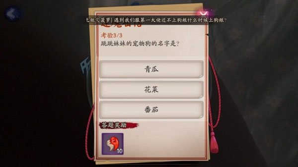 游家吧小编分享了有关跳跳妹妹的宠物狗的名字是:阴阳师逢魔密信中有这么一道考验:跳跳妹妹的宠物狗的名字是?这道题考查了玩家对于跳跳妹妹宠物狗昵称的了解,赶快来看下吧。,具体的内容如下所述!