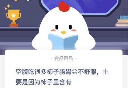 游家吧小编带来了空腹吃柿子不舒服是因为柿子含有:支付宝蚂蚁庄园小课堂11月2日的第二个问题是:空腹吃很多柿子肠胃会不舒服,一起来看下正确回答吧。,想要了解相关的内容持续关注吧!