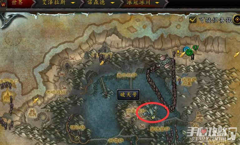 破天号在诺森德冰冠冰川的上方,打开地图后选择诺森德的冰冠冰川,在地图中可以看到一个飞艇。