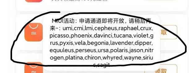 信息显示,“MIUI活动:申请通道即将开放,请稍后再来”后有很多英文字母,其实这些英文字母就是机型代号。