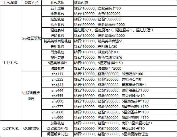 zhs000、zhs111 、zhs222 、zhs333 、zhs444 、zhs555 、zhs777、zhs888、zhs999 (钻石*90w、经验*180W、五星英雄*5、先祖魂石*10(可以获得史诗级英雄)