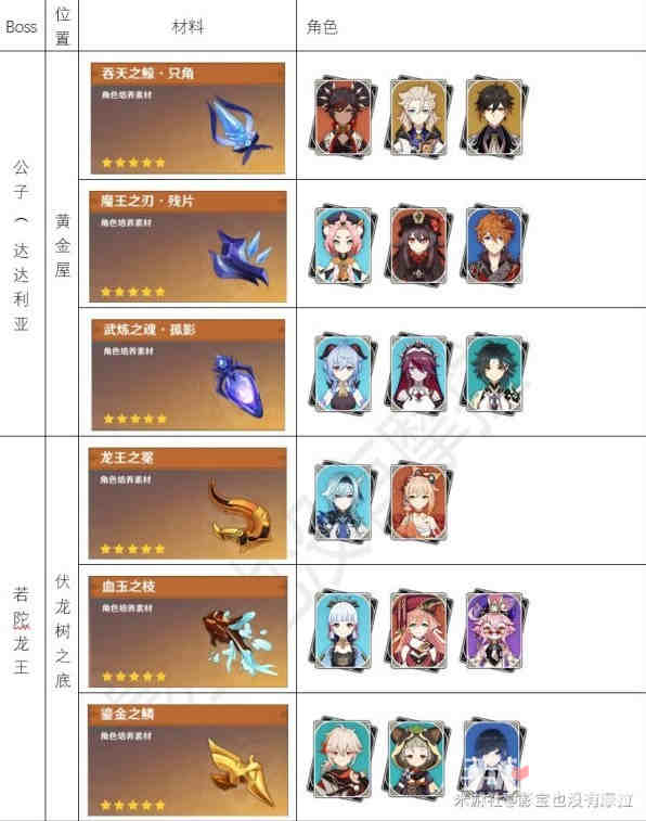 《原神》3.1版全角色周本boss材料一览