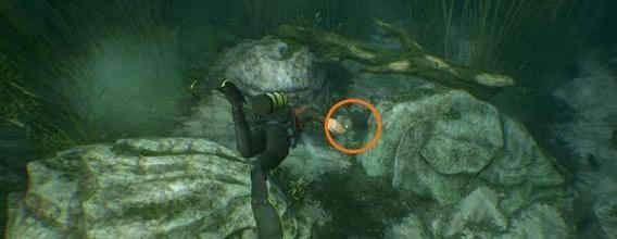 剧情后,向右侧游动一点,在2个岩石上架着横木的地方,岩石中间可发现宝藏3。