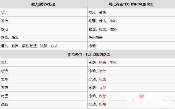 对已经中状态异常的敌人进行特定的攻击,敌人会进入TECHNICAL状态。对TECHNICAL状态中的敌人可以造成更多的伤害,也有几率打晕敌人。