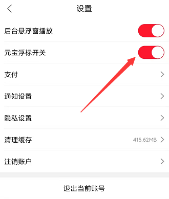 3、将【开启元宝浮标】开关,调整到如下图所示状态。问题即可解决。