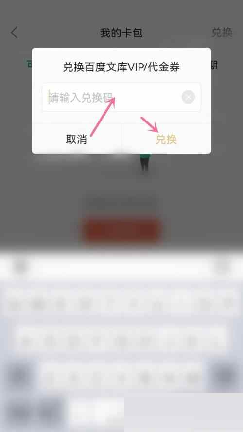 4、最后打开百度文库VIP/代金券的对话框中“输入兑换码”后选择“兑换”选项。