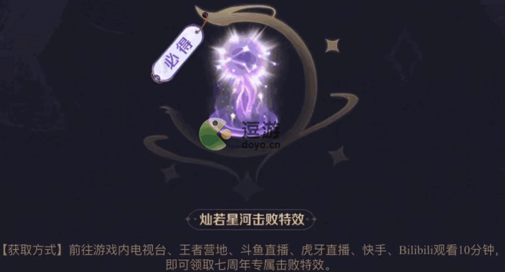 1、灿若星河击败特效可以通过观看【共创之夜】直播获取,大家前往游戏内电视台、王者营地、斗鱼直播、虎牙直播、快手、Bilibili观看10分钟共创之夜直播即可领取七周年专属击败特效。
