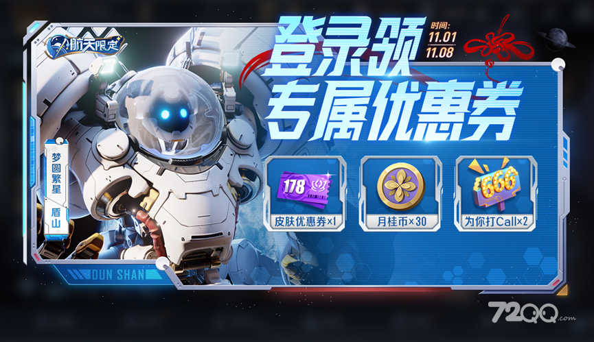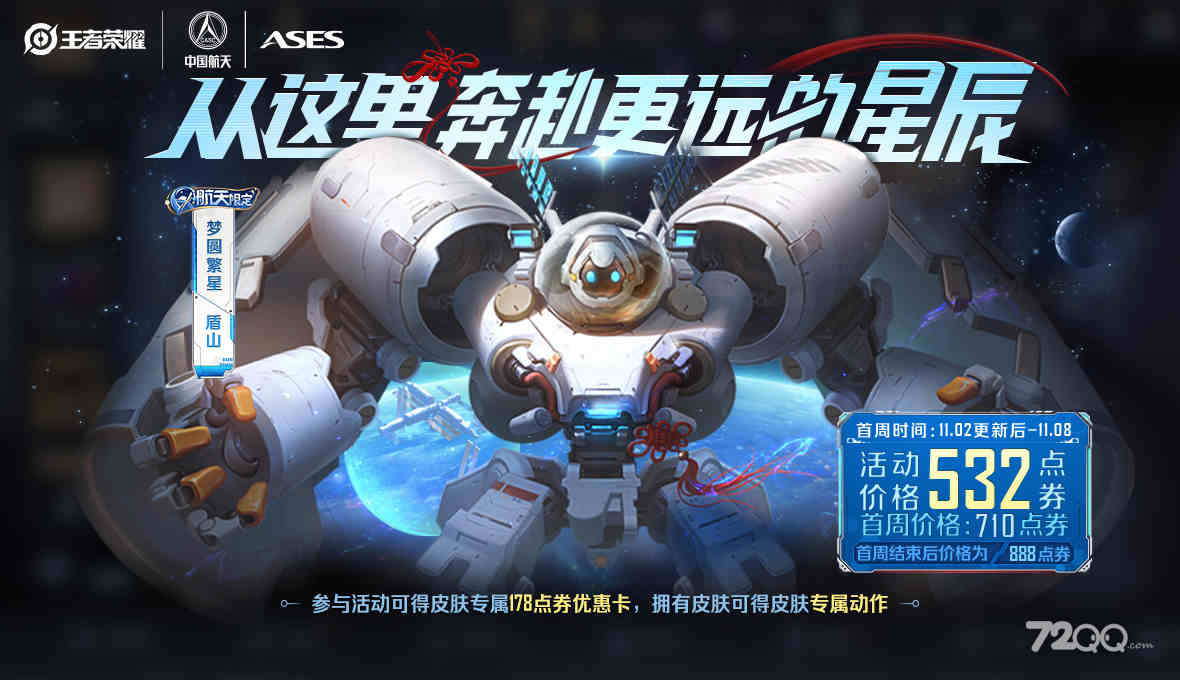 11月1日起,参与【梦圆繁星】活动,可领取178点券皮肤专属优惠卡(盾山-梦圆繁星),最低532点券即可购买皮肤!