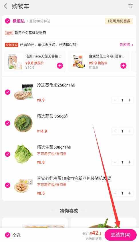 4、进入购物车,点击“去结算”