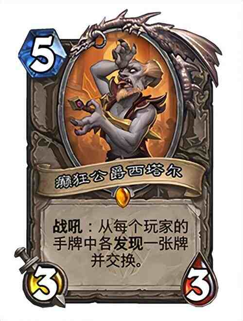 而癫狂公爵西塔尔这张牌也在这次的补丁里面进行了调整,因为他的战吼技能:从每个玩家的手牌中各发现一张牌并交换,太过imba。这种在对局中破坏节奏的卡本来条件就不能太过轻易达成,要么就是任务、注能,要么就是提高这张手牌的费用,而全新的补丁出来以后,西塔尔也的确是加了一费,防止古夫在四费的时候就被换走。