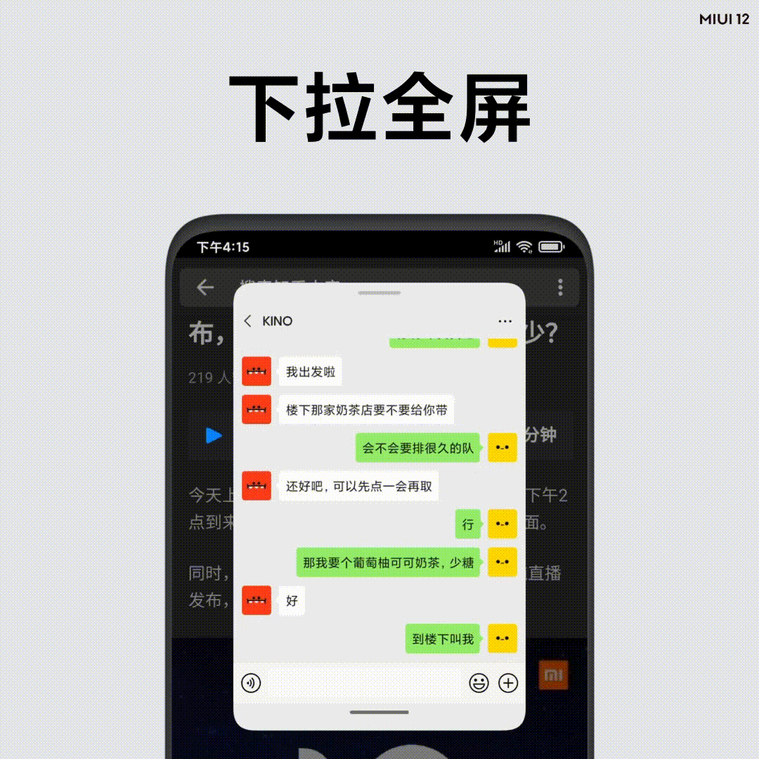 2、来消息时轻轻下滑即可展开进入小窗模式,上滑即可退出。对于只需要查看状态的应用,拖至屏幕角落即可悬挂。