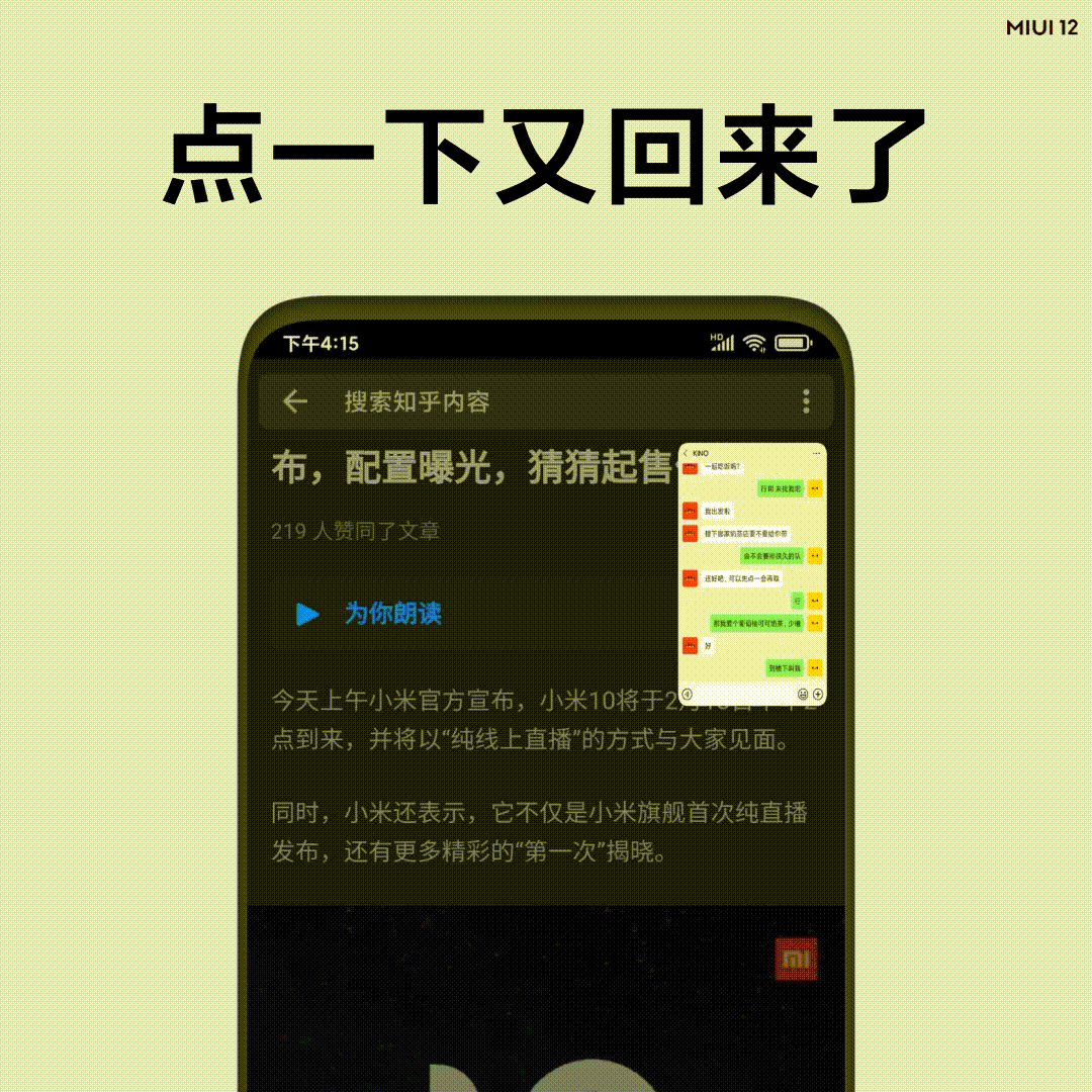 miui12全局自由窗口是什么:1、MIUI 12新增的一个重要功能是支持全局自由窗口,召之即来,挥之即去,一步挂起。全局自由窗口符合手势操作直觉,适应多种使用场景。
