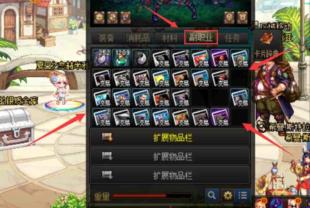 1、首先进入到dnf游戏主界面,打开背包,在副职业一栏里找到卡片。