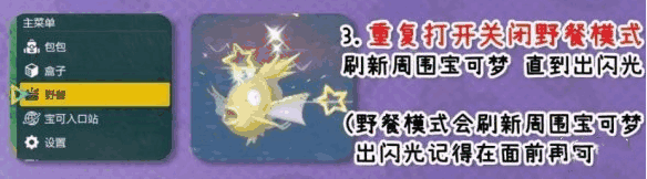重复打开关闭野餐模式,刷新周围宝可梦,直到有闪光出现,出闪光之前记得存档,千万不要忘记了。