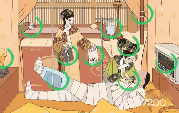 1、【气死大胖橘】关卡需要找出十处不和谐的地方,分别是:拖鞋、绿色毒药、大清人寿、四郎受伤、点滴瓶、X光片、足球、足球奖杯、心率图、皮带