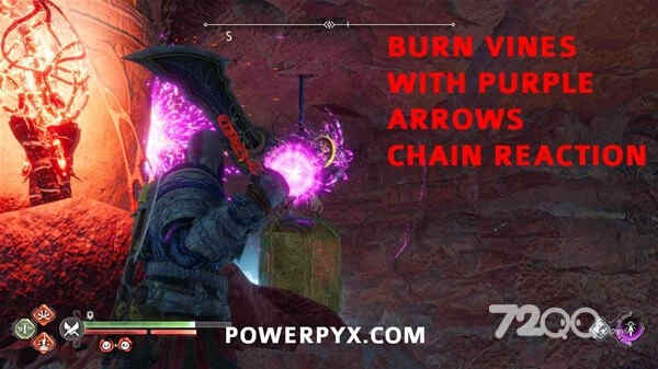 在该地区的南部,有一个小洞穴,天花板上挂着两面紫色镜子和两套红色炸药袋。向右边的镜子扔一把斧头,摆脱那边的红色麻袋。然后烧掉左边镜子上的藤蔓。你通过向它发射紫色箭头并与混沌之刃引起连锁反应来做到这一点。然后转动左边的镜子面对右边的镜子,右边的镜子面对左边的红色麻袋。将斧头扔向左边的镜子,它会偏转到右边的镜子上,右边的镜子会偏转到红色的袋子上,以清理道路。然后,在那些红色麻袋后面发现了传说中的箱子。