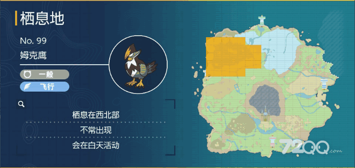 姆克鹰是一般和飞行属性的宝可梦,是姆克儿的最终形态,而想要抓姆克鹰可以去地图的西北部的大锅湖,这家伙不常出现,会在白天活动,具体分布区域如下图。