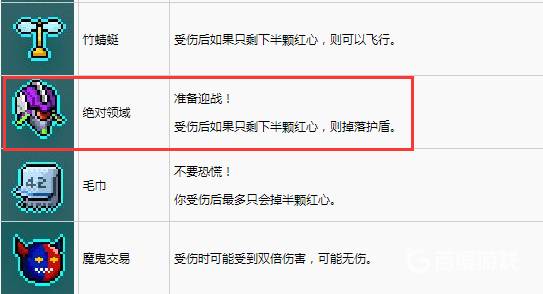1、游戏中使用道具绝对领域,会在你受伤后如果只剩下半颗红心,则掉落护盾;