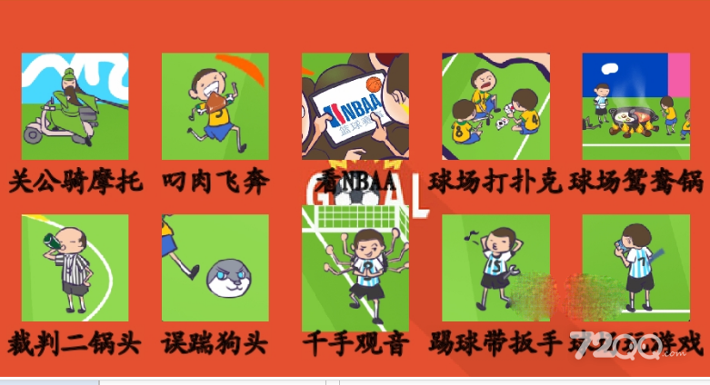 2、画面左上角是关公骑摩托,左边的球门处有人在打牌,左下角的球员在叼肉飞奔